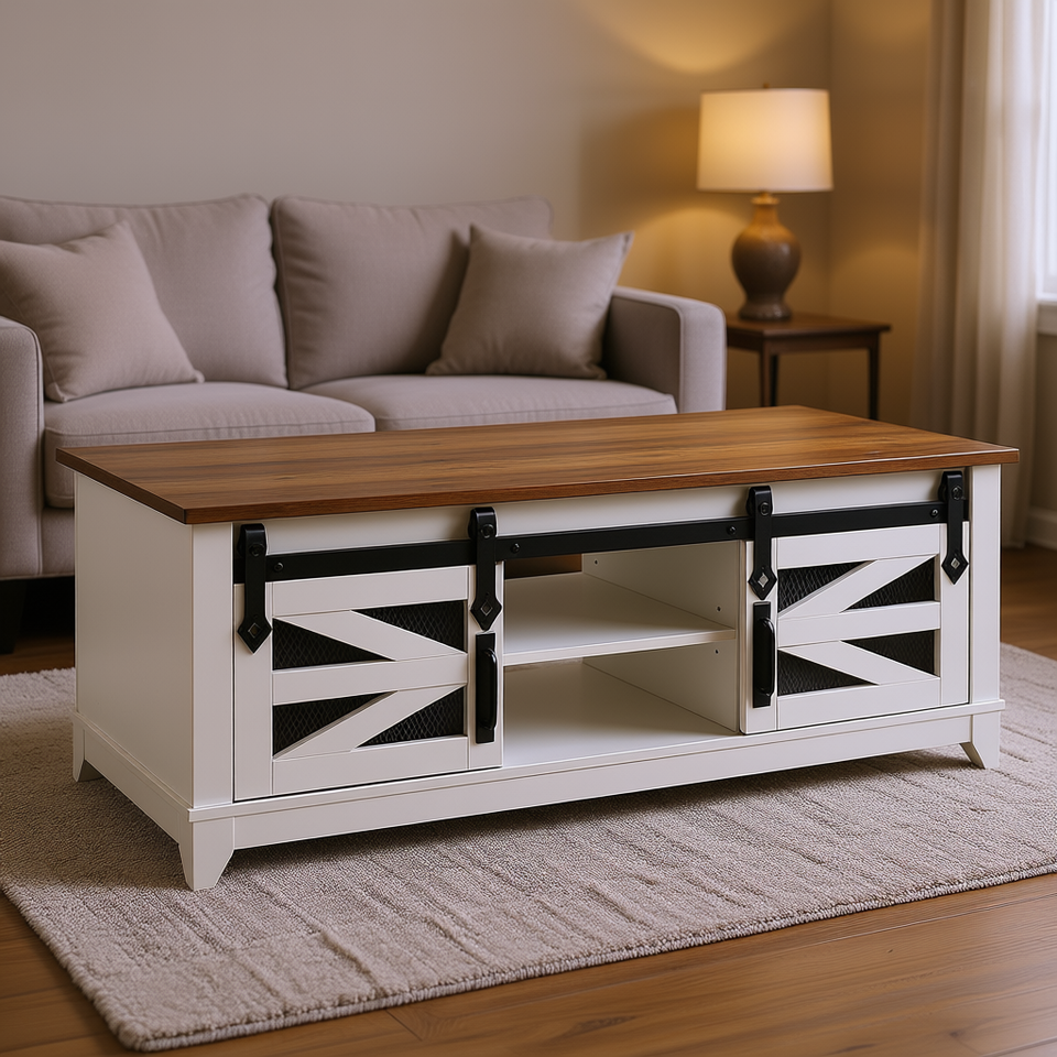 Rustic Wood Coffee Table 48 Inch Double Barn Doors Removable Shelves Living Room Furniture