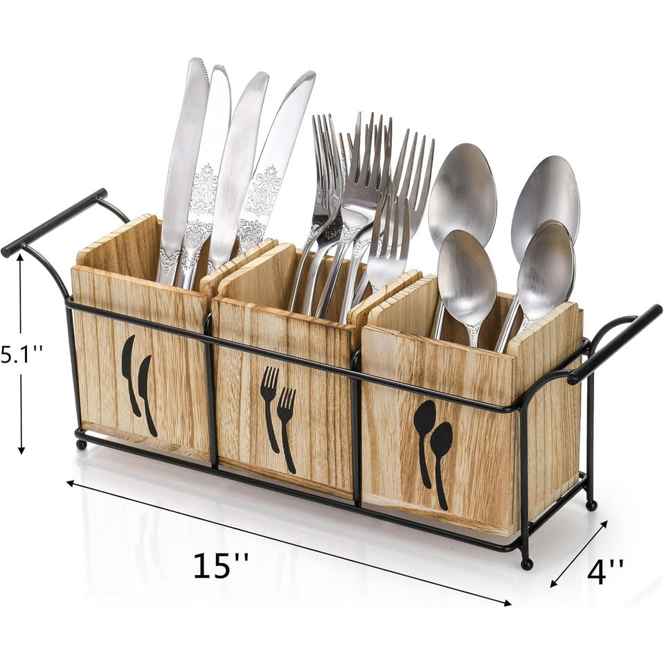 Rustic Wood Hand Carved Caddy with Handle Kitchen Dining Storage Rack Cutlery Holder Utensils Stand Napkin Holders for Dining