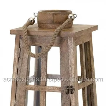 Rustic Wooden Lantern with Rope Handle and Metal Accents Ideal for Home Decor and Outdoor Ambiance