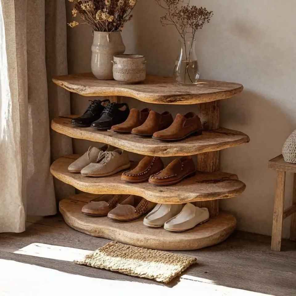 Rustic Wooden Shoe Rack Four Tier Natural Wood Slab Shelves Handcrafted Organizer Storage Stand for Home Entryway