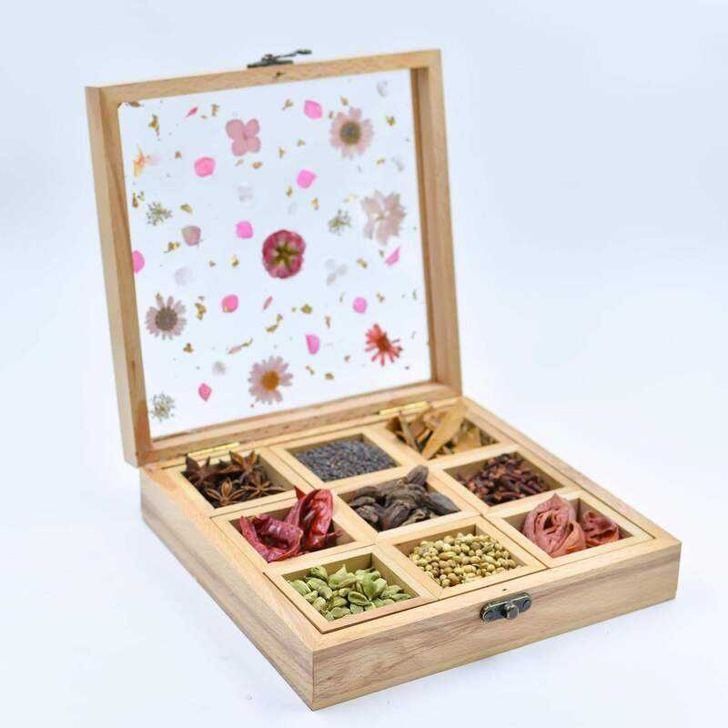 Rustic Wooden Spice Box with Lid and Multiple Sections for Neat Storage of Spices Herbs Seasonings and Kitchen Use