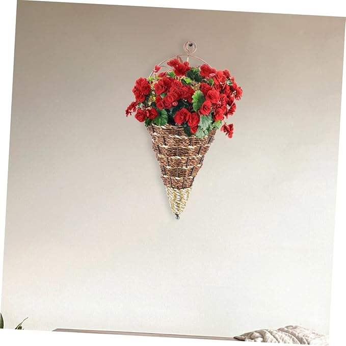 Rustic Woven Wall Planter Cone Shaped Simulated Flower Basket for Home and Garden Decor Art Hanging Flower Pot