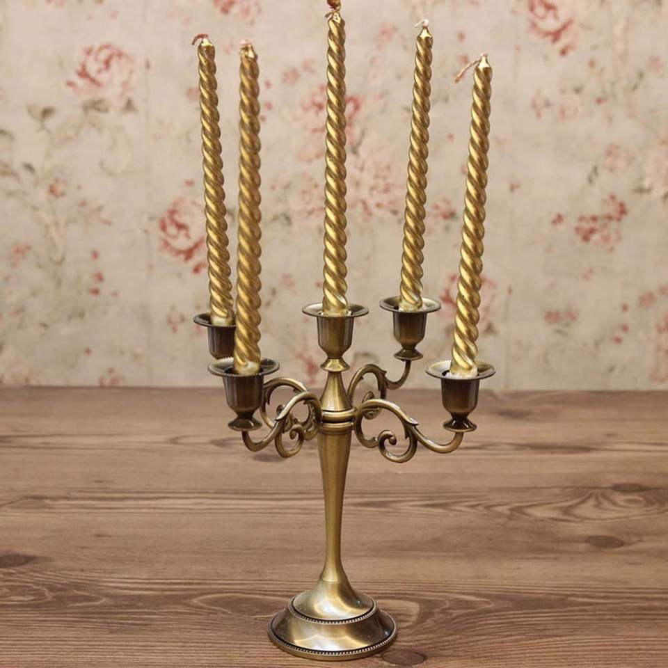 Rustic farmhouse metal candelabra for dining table decor with pillar candle display and vintage interior style