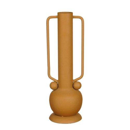 Metal iron flower vase yellow colored with traditional motifs, blending seamlessly into vintage cottage or farmhouse interiors