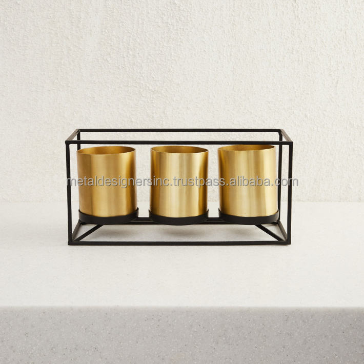 S/3 Brass Planter With Black Stand Round Herb Pots Gold Herb Pot Planter With Tray for Indoor and Outdoor Flower Pot Garden