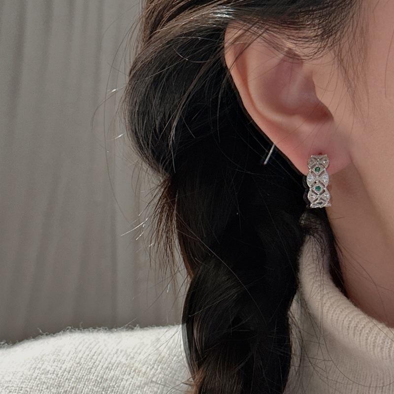 S925 Pure Silver Antique Micro Inlaid Zircon Earrings Light Luxury Simple Fashionable Curved Design Green Niche Diamond Jewelry