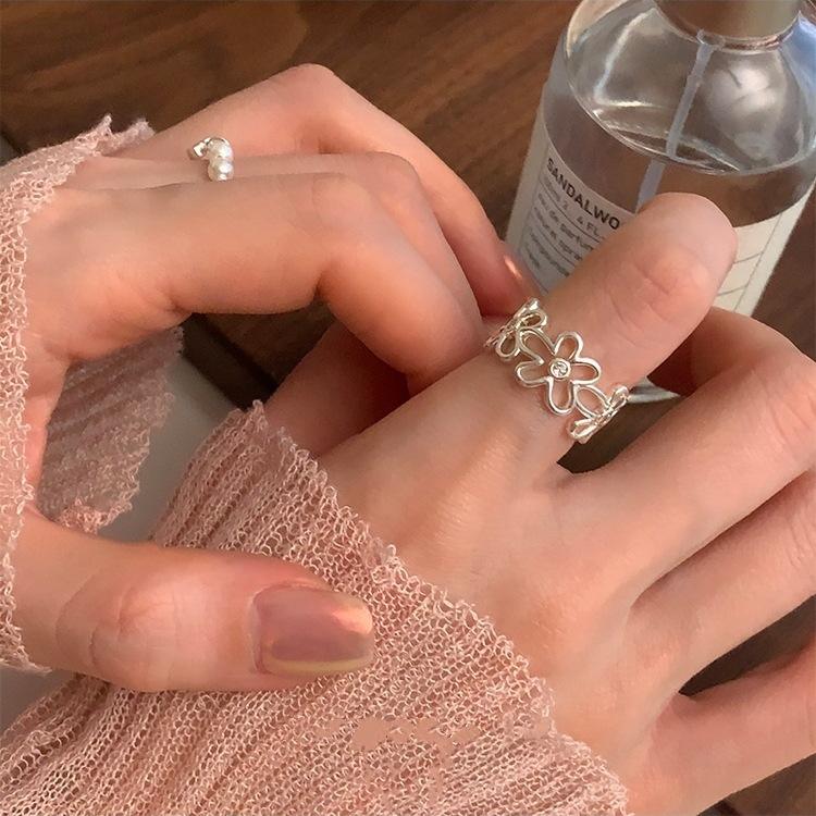 S925 Pure Silver Hollow Flower Ring for Women Sweet Japanese Casual Style Fresh Fashionable Personalized Index Finger Inlay Ring