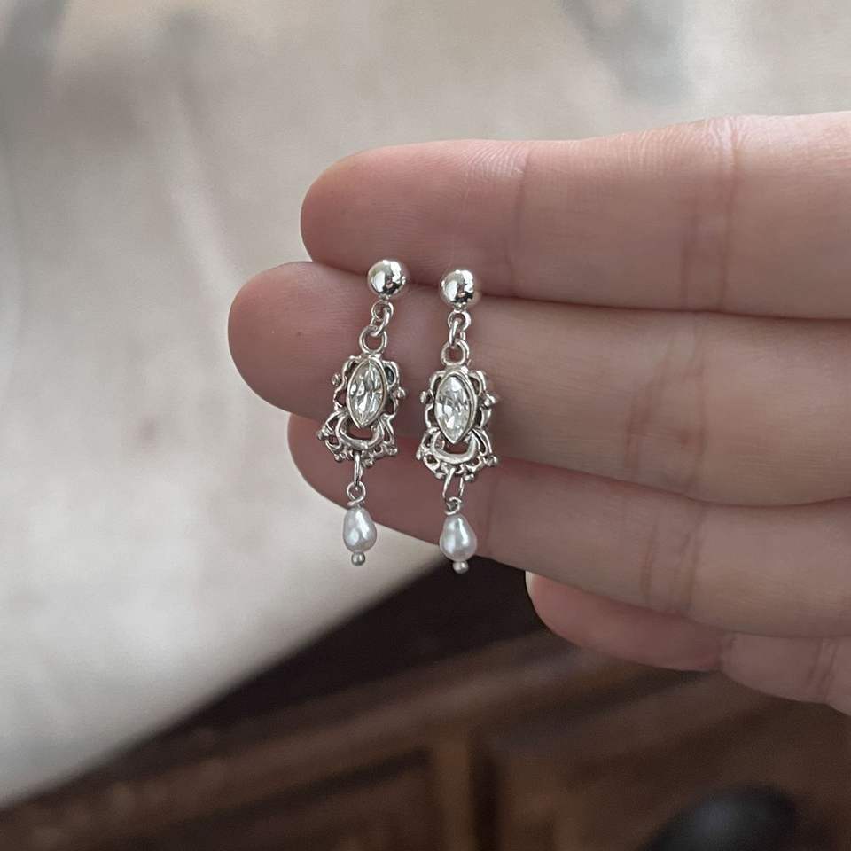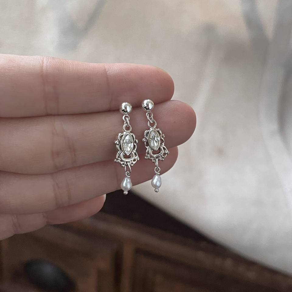 S925 Pure Silver Hollow Water Droplet Design Retro Light Luxury Zircon Pearl Tassel Dangle Earrings Niche Fashion Accessory