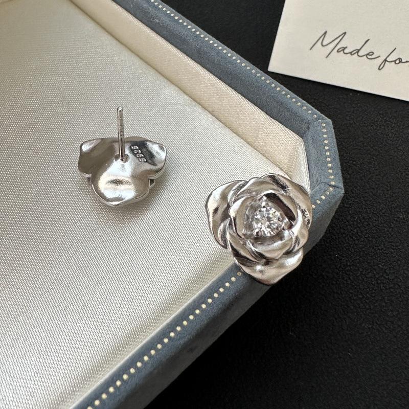 S925 Pure Silver Luxury Zircon Rose Stud Earrings Antique Style Light Jewelry-Wholesale