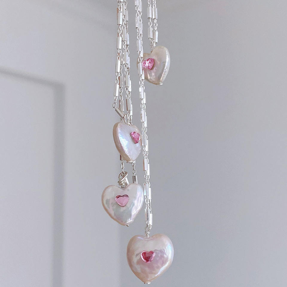 S925 Pure Silver Natural Baroque Button Pearl Heart Necklace Pink Diamond Starry Retro Fairy Pink Purple Pearl Pendants Charms