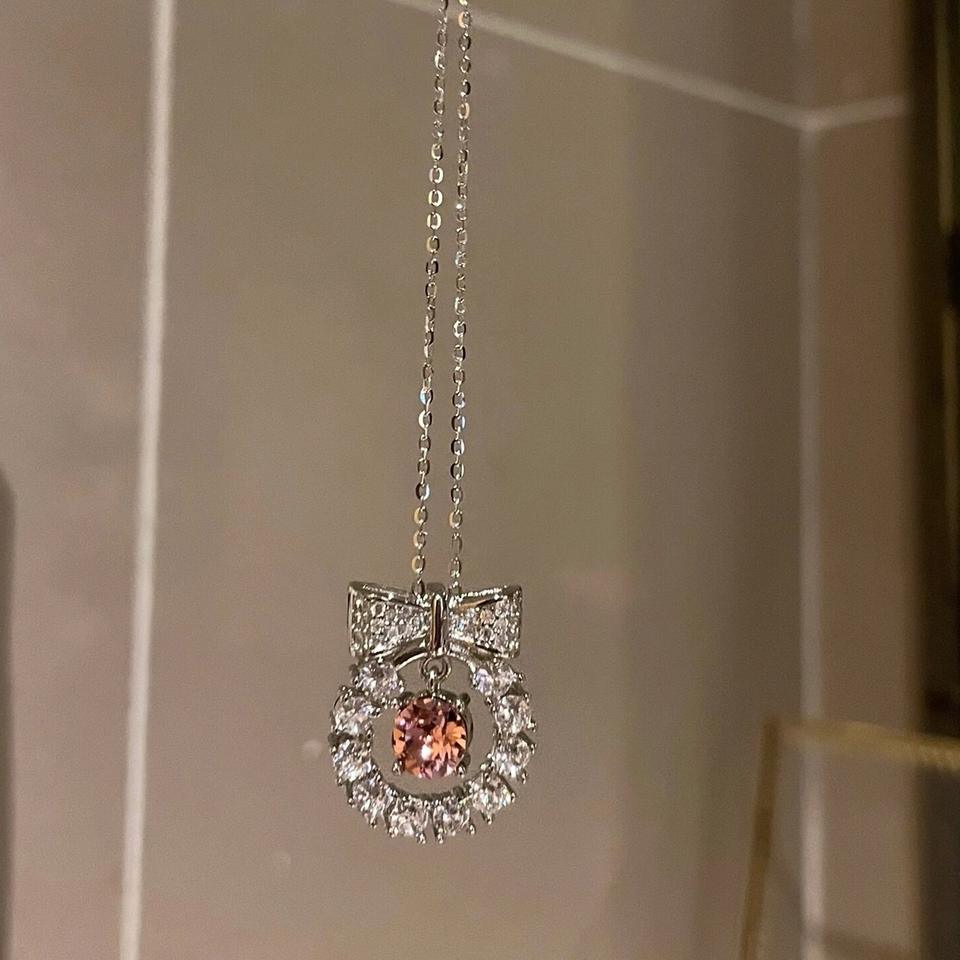 S925 Pure Silver Princess Style Bow Pink Diamond Necklace Versatile Daily Use Collarbone Light Luxury Sweet Fashion Pendant