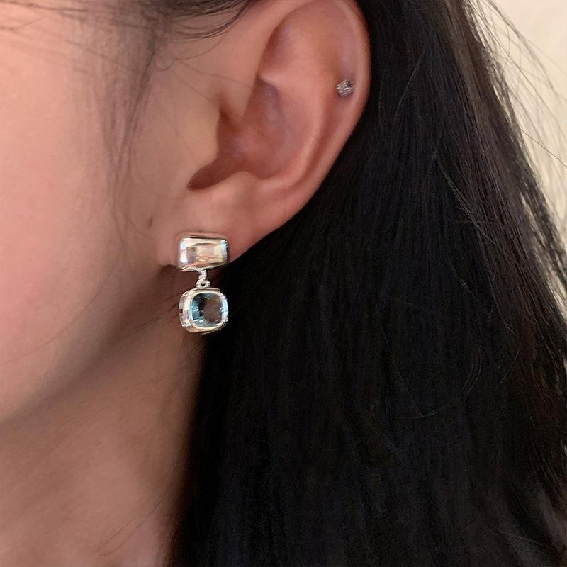 S925 Pure Silver Sea Blue Block Rock Sugar Earrings with Clear Water Blue Cool Feeling 18K Gold with Niche Simple Temperament