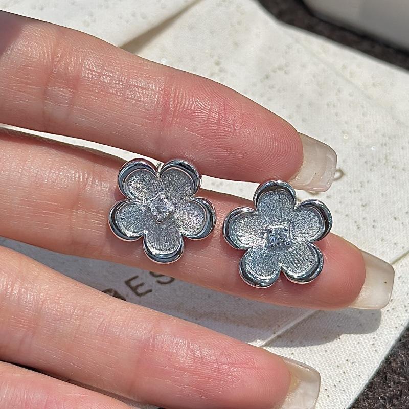 S925 Pure Silver Small Flower Dangle Earrings Niche Design Light Luxury Fashionable Medieval Vintage Style Brushed Zircon