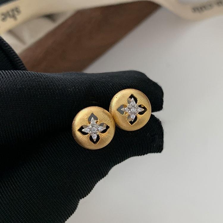 S925 Pure Silver Vintage Italian Precision Brushed Craftsmanship Luxurious Gold-Plated Clover Diamond Studded Fine Stud Earrings