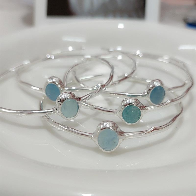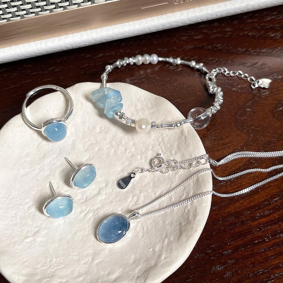 S925 Pure Silver Women's Fine Jewelry Set Aquamarine Necklace Broken Silver Pearl Bracelet Layered Ring Oval Shaped Natural