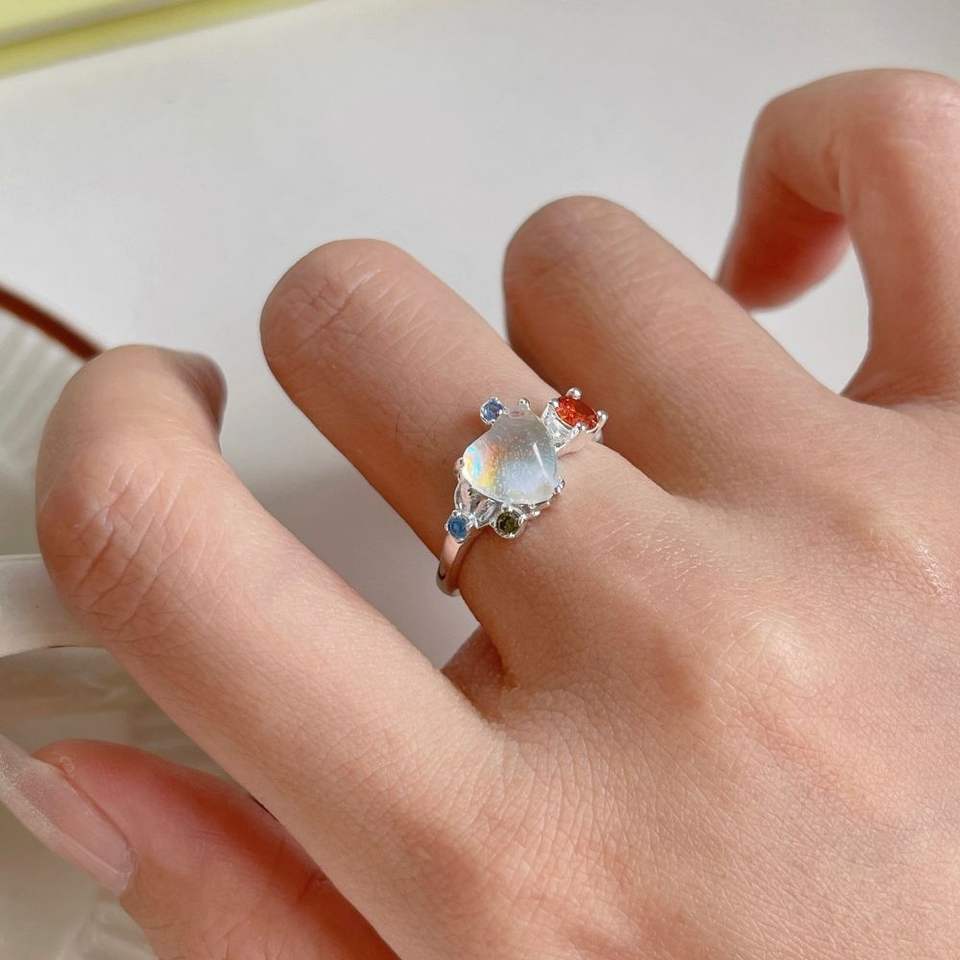 S925 Pure Silver Women's Open Ring Niche Sweet Design with Moonstone Heart and Micro Inlaid Colorful Zircon Crystals