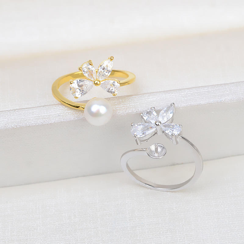 S925 Silver Adjustable Female Finger Ring Lucky Grass Pearl Accessory Open Style Inlay Fashionable Living Ring for 11 Sizes