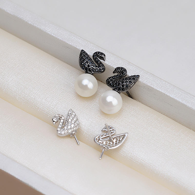 S925 Silver Black Swan Earring Pendant and Necklace Set Fine Jewelry with Empty Pearl Support Accessories New 1346