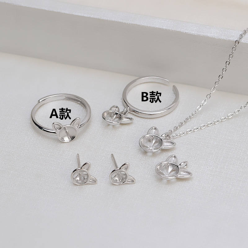 S925 Silver Cat's Ears Pendant and Ring Set Steamed Cat-Ear Shaped Bread with Pearl for Women's DIY Fine Jewelry