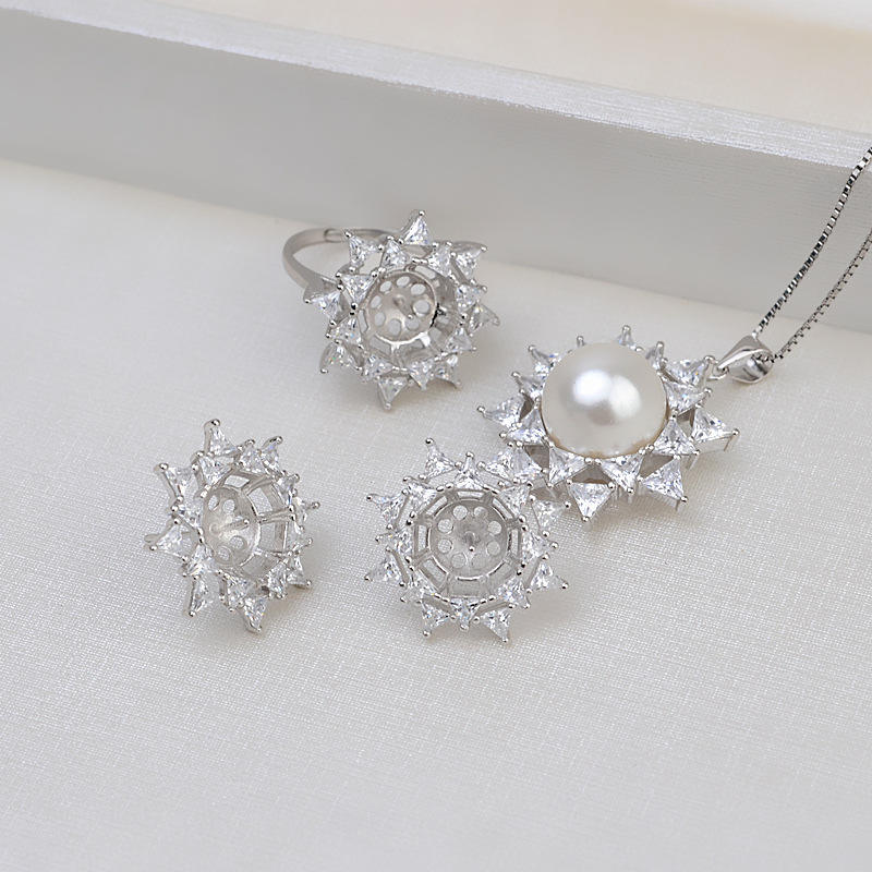 S925 Silver Fine Jewelry Set for Women Personalized Ear Nail Head Ring Triangle Diamond Big Pearl Includes DIY Accessories Tray