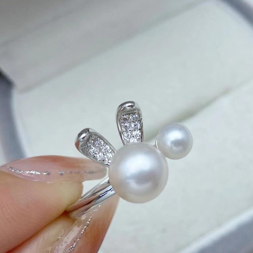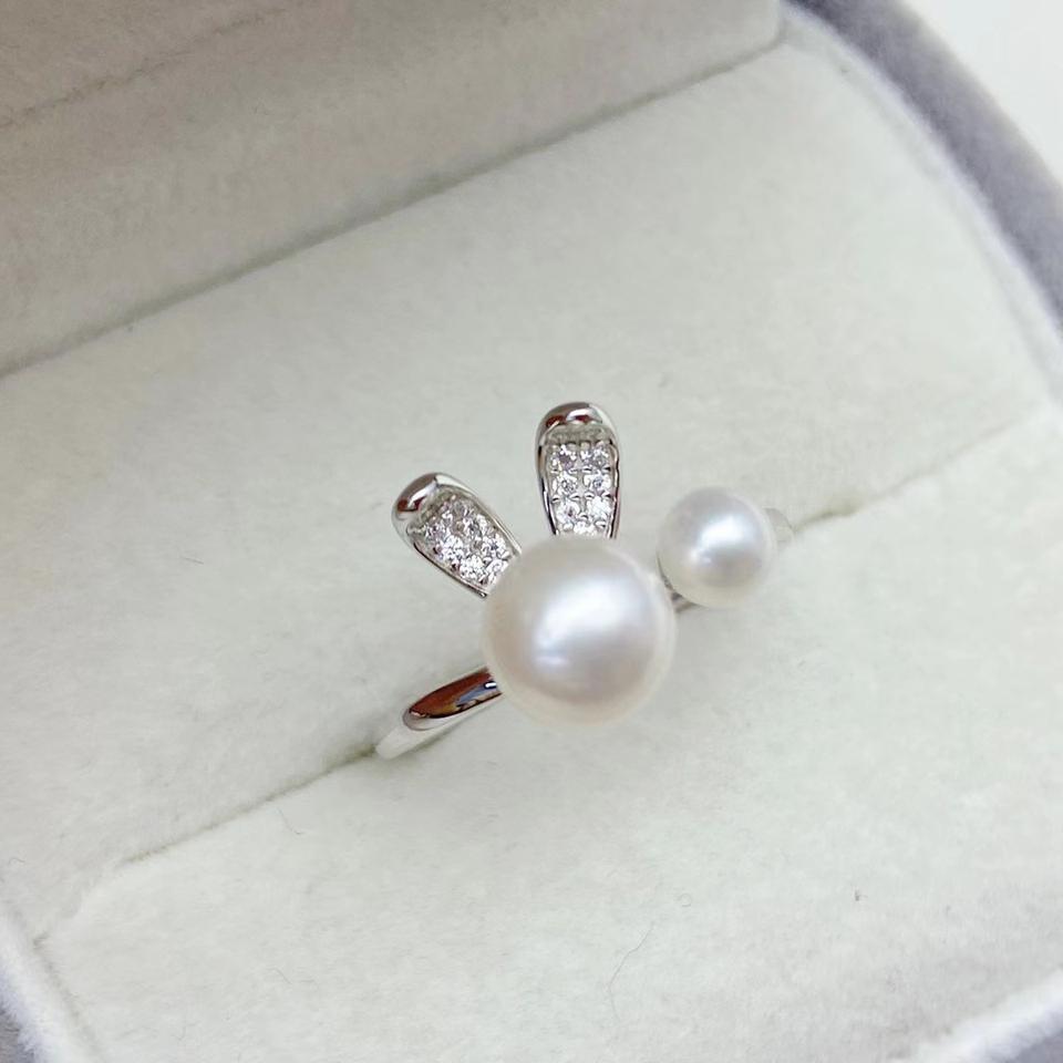 S925 Silver Pearl Ring Good Quality Inlay with Large 7-8mm Round Pearl Small 5mm Pearl Cute Elegant Little White Rabbit Design
