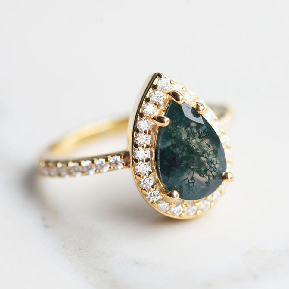 S925 Silver Polished Dark Natural Green Moss Agate Faceted Crystal Stones Meaning Women Ring for Sale