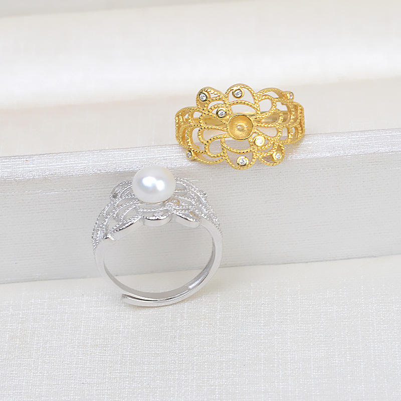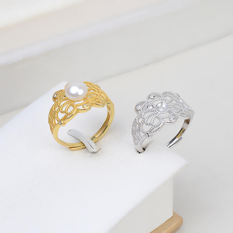 S925 Silver Ring for Women Retro Palace Open Design with 18K Plating 4-6 Size Living Mouth DIY Pearl Jewelry 46 Accessories