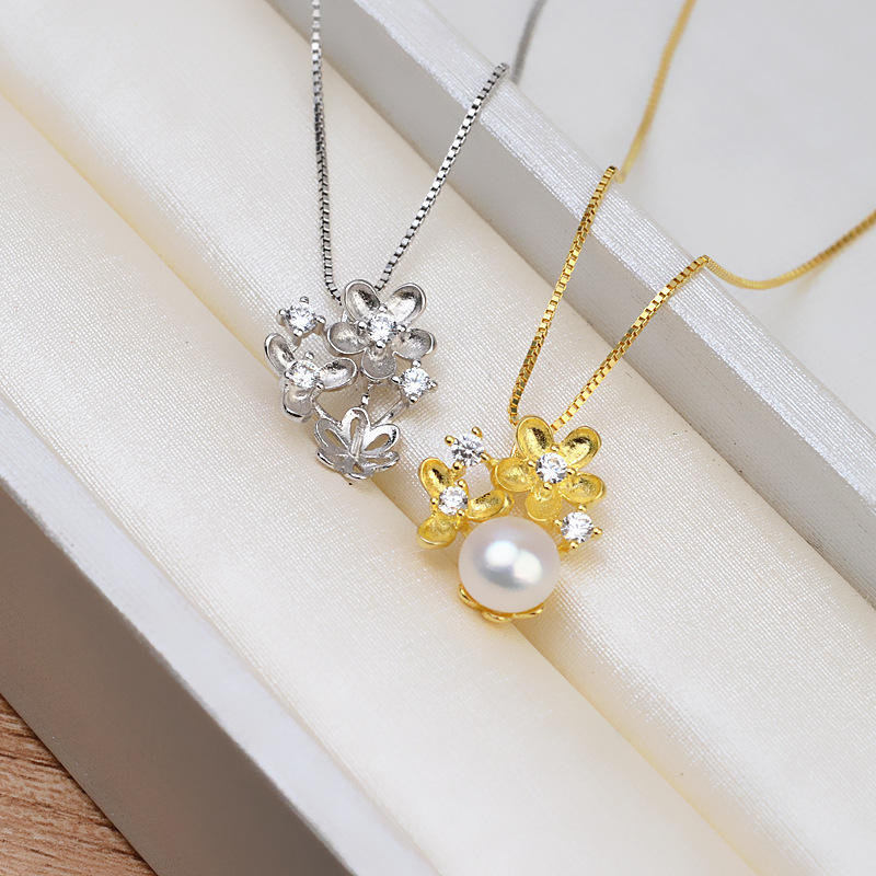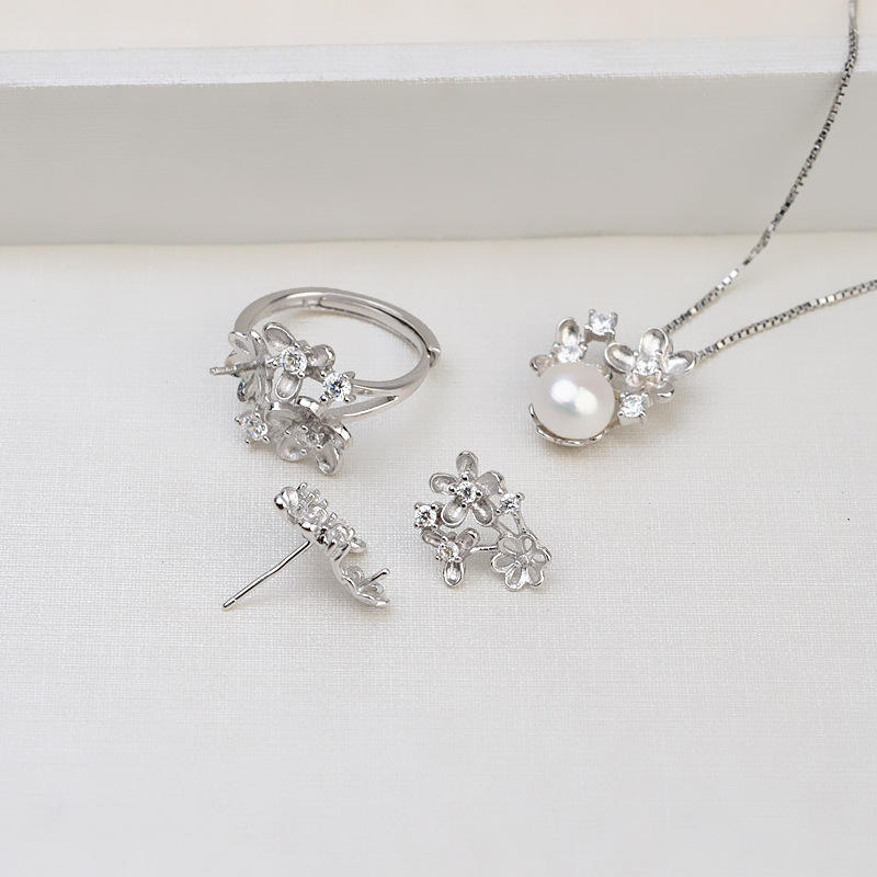 S925 Silver Small Flower Earring and Pendant Set Female Open Mouth Ring DIY Pearl Jewelry Accessories Fine Jewelry 1283
