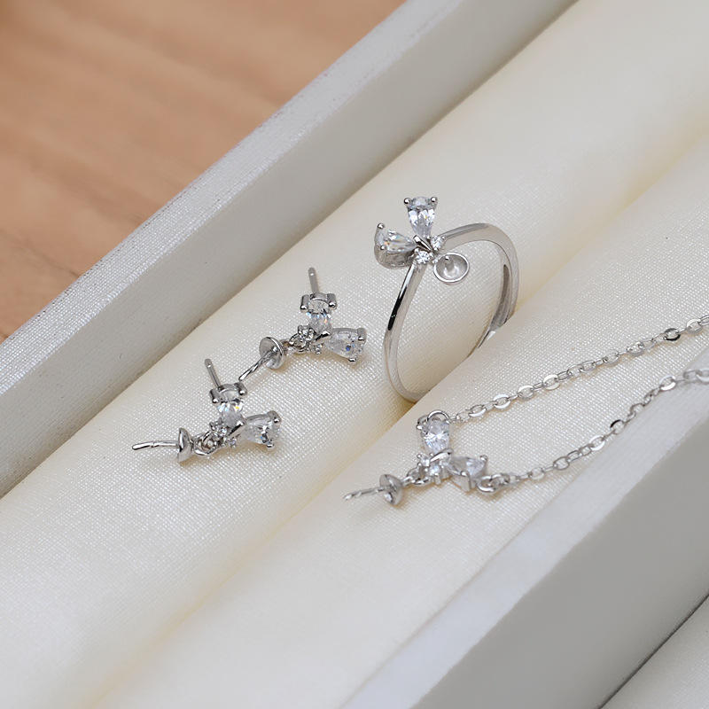 S925 Silver Sprout Grass Necklace and Open Ring Set with Empty Stand 1256 DIY Accessories Fine Pearl Jewelry Set