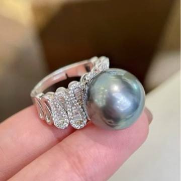 S925 Silver Wide Edition Ring with 13-14MM Natural Tahitian Pearl Round Strong Light with Minimal Flaws