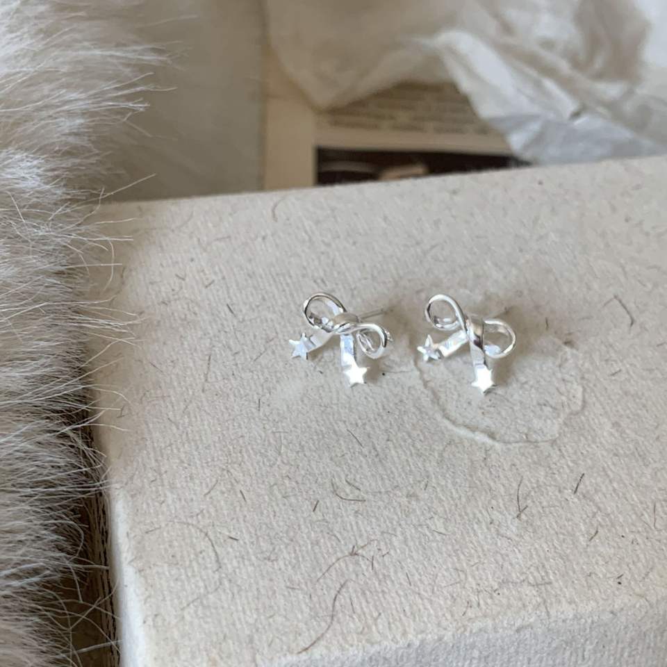 S925 Solid Silver Korean Style Sweet and Cute Starlight Ribbon Bow Earrings Versatile High-End Fashion Studs