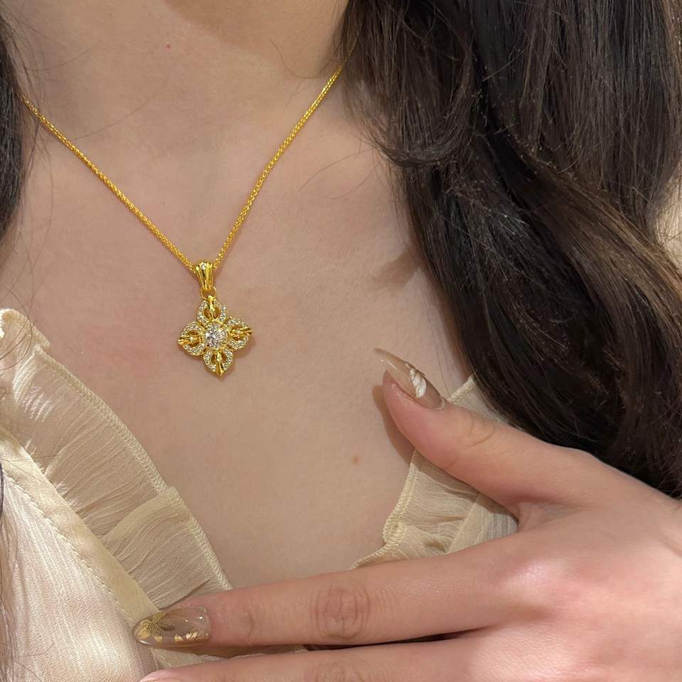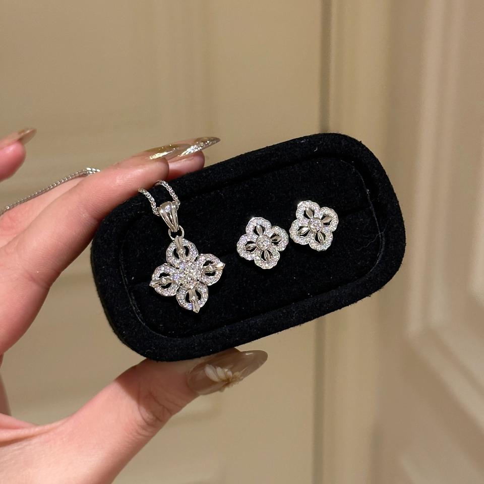 S925 Sterling Silver Diamond Inlaid Retro Luxury Craft Four Leaf Flower Necklace Earrings Set Niche Luxury Inlaid Retro Jewelry
