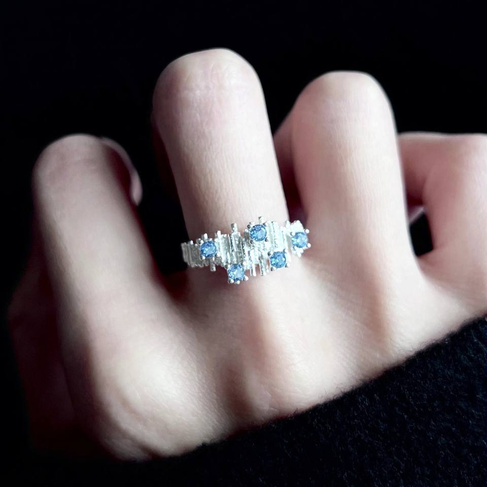 S925 Sterling Silver Irregular Pleated Sea Blue Diamond Ring Personalized Open Design Versatile Layered Inlay Cut