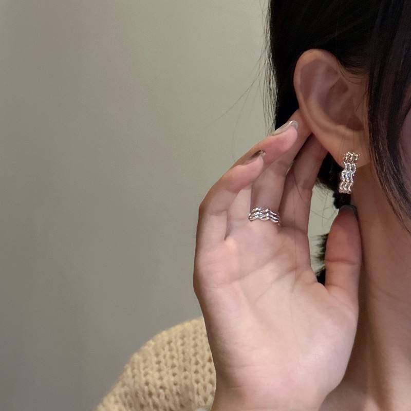S925 Sterling Silver Plated Women's Three-Layer Wave Texture Earrings Retro Korean Style Simple Niche Design Fashionable