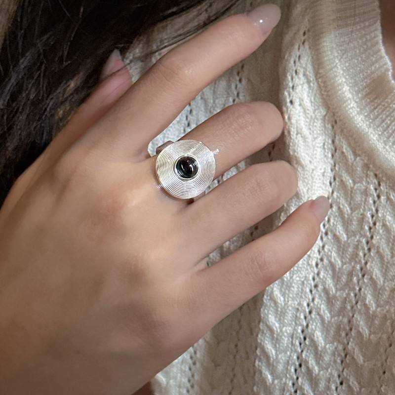 S925 Sterling Silver Princess Cut Diamond Korean Retro Style Round Ring with Black Agate Earrings Niche Design