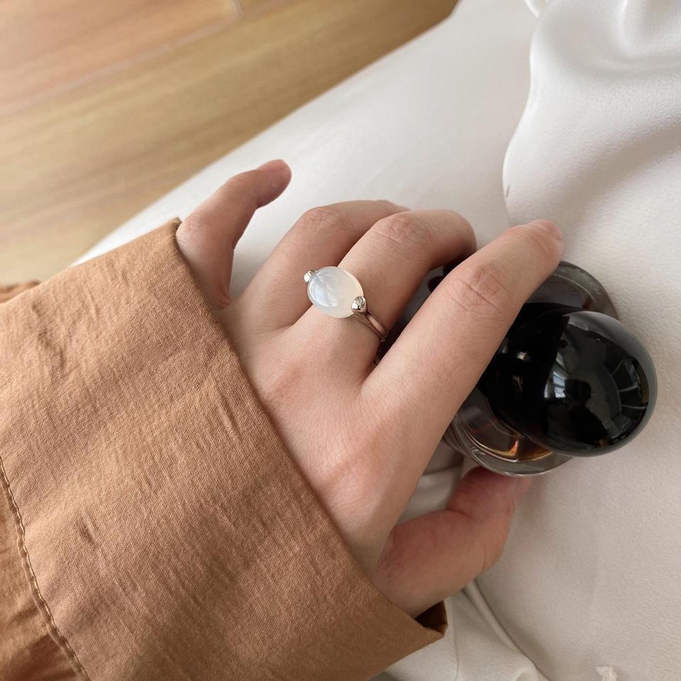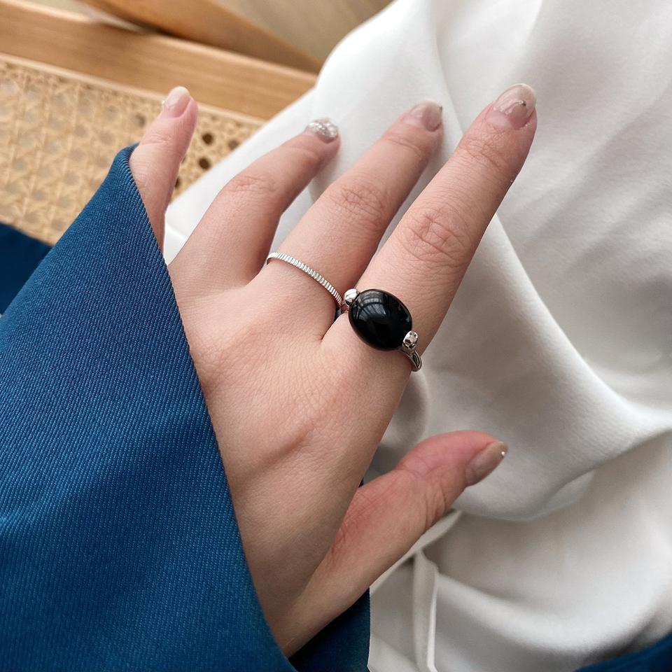 S925 Sterling Silver Ring for Women Simple Fashionable Versatile with Inlay Oval Black Agate White Jade Marrow Open Niche Design