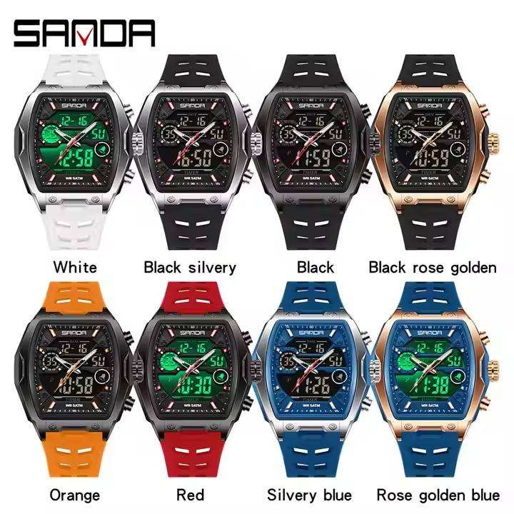 SANDA With Tonneau Dial Waterproof Leather Band Multifunction Business Timepiece Men's Dual Display Sport Watch 6235