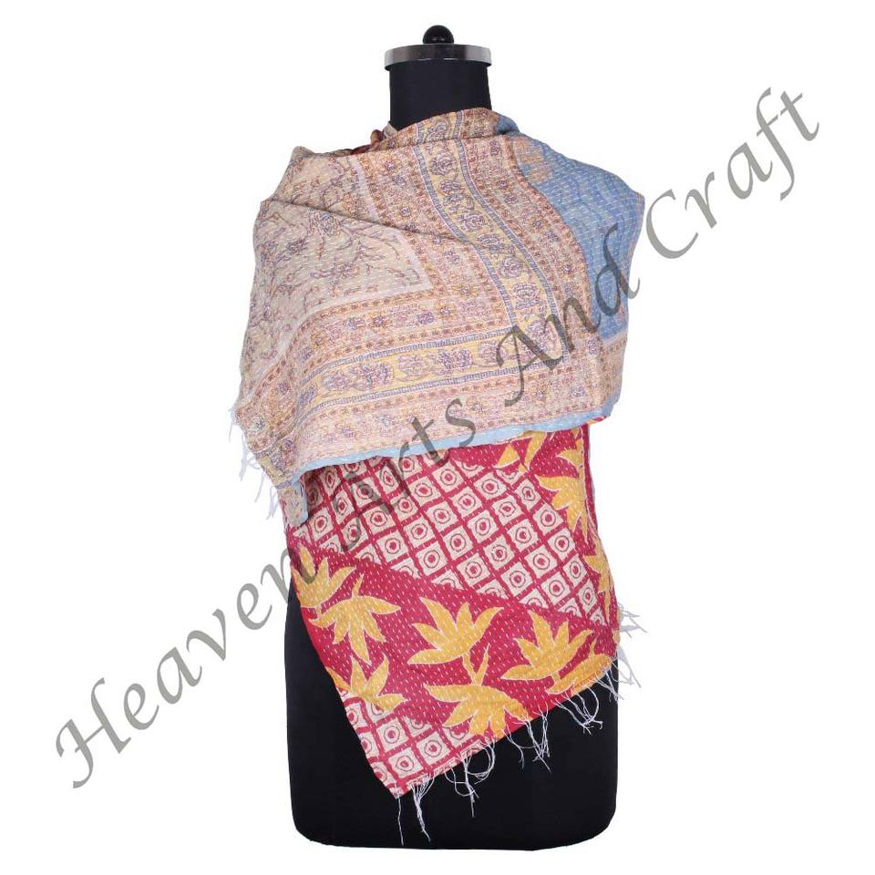 SC1036 Vintage Kantha Work Cotton Handmade Scarf Trendy Design Girls Allover Hand Stitched Plain Style Long Length