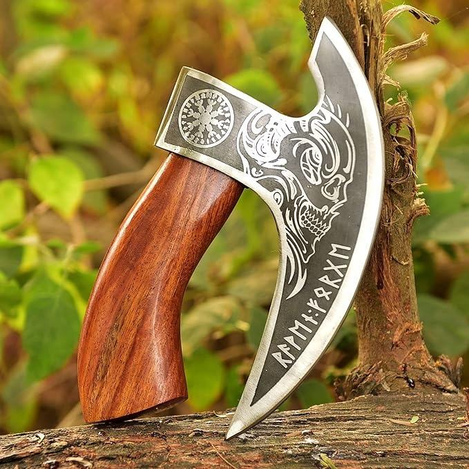 SCL Handmade Eco-Friendly Customized Damascus Steel Pizza Cutter Axe with Wooden Handle Etching Head Leather Sheath