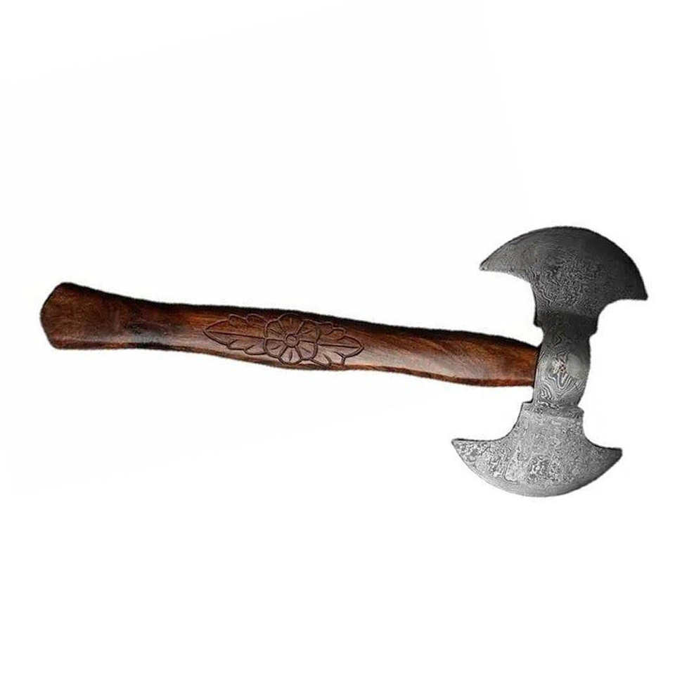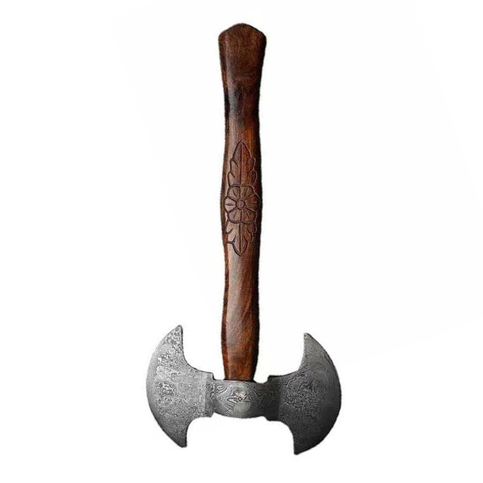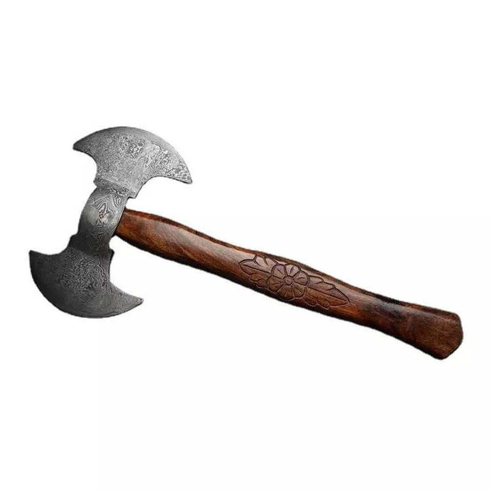 SCL Industrial Hand-Forged Viking Survival Damascus Steel Double Head Axe Leather Sheath Ash Wood Handle 1.5 KG Weight Custom