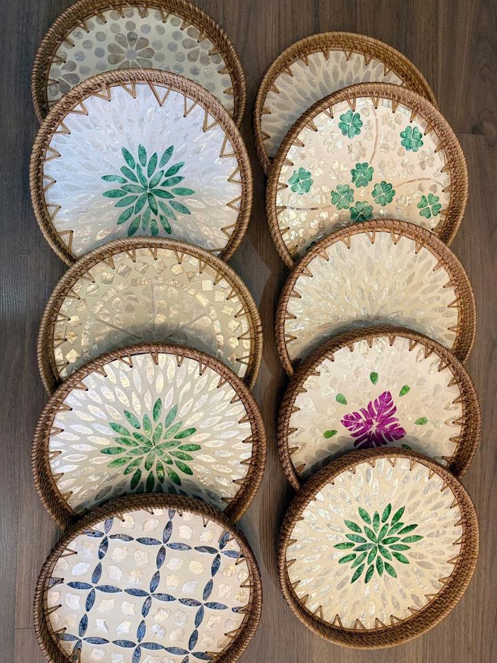 SET 3 OF MOTHER OF PEARL INLAY RATTAN TRAY
