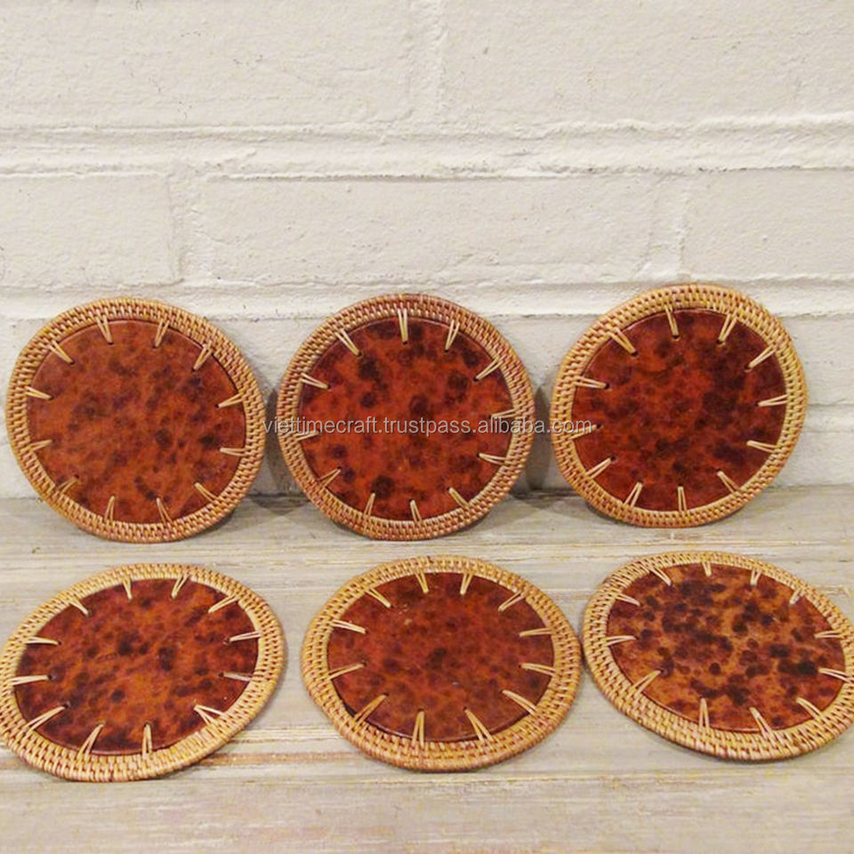 SET 6 Classic Rattan Coasters with Wood for Dining Room or Kitchen Wholesale Bulk Carton Packaging