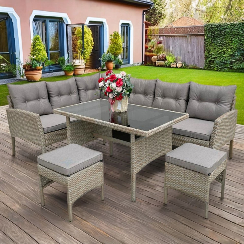 rattan, steel, tempered glass, polyester cushionmaterial