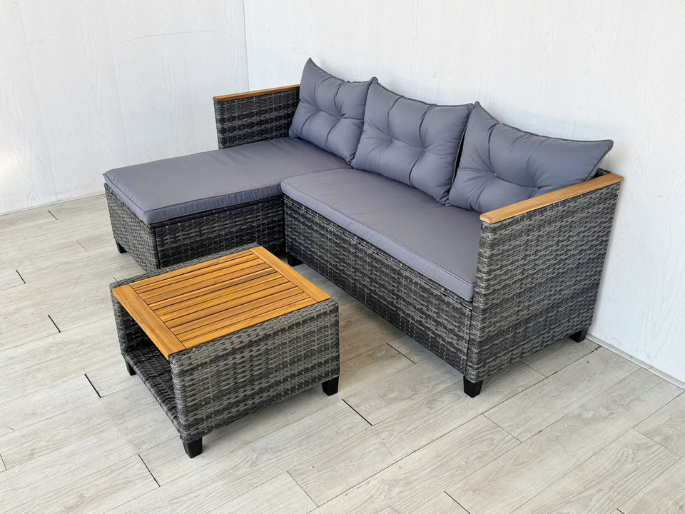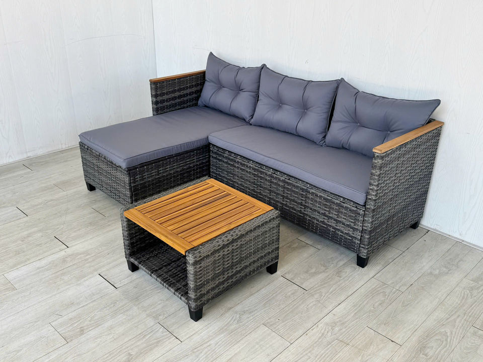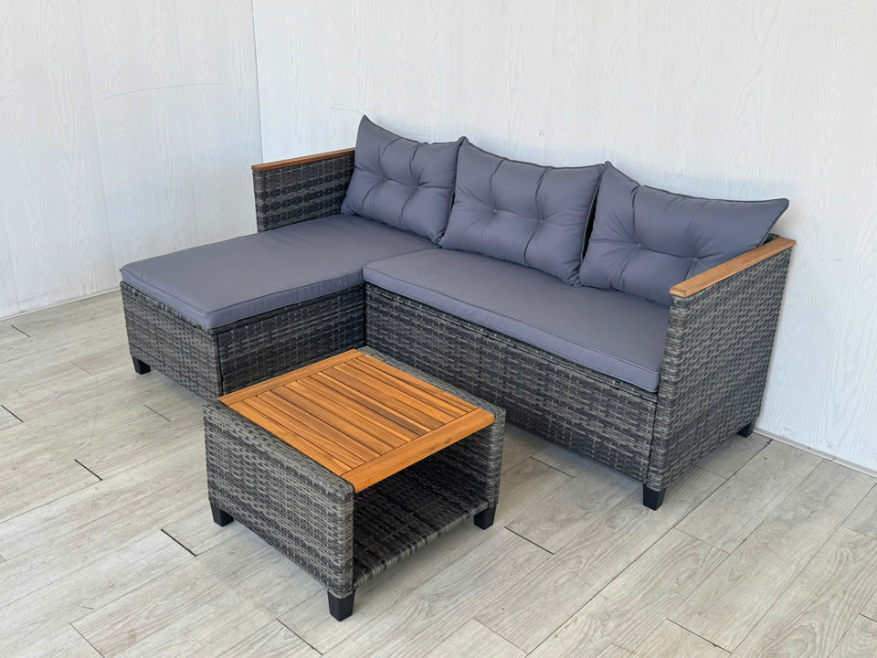 Rattan, steel, Acacia wood, polyester cushionmaterial