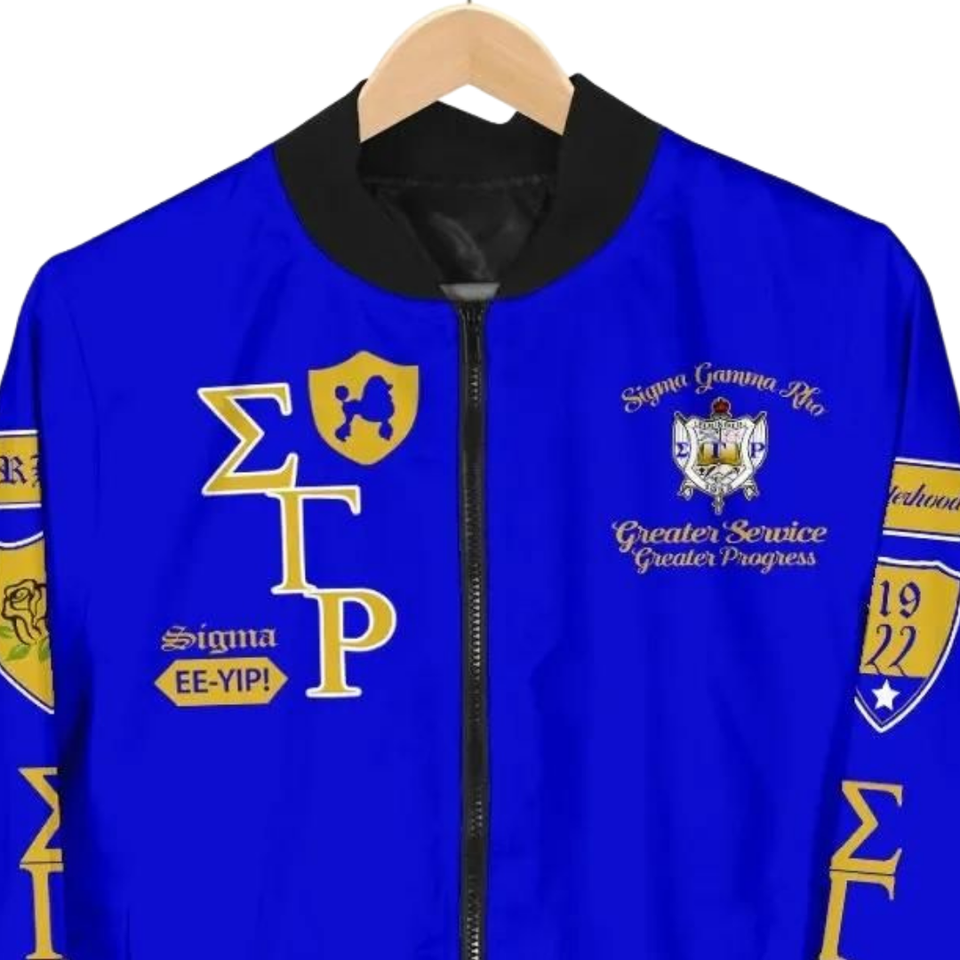 SGRho Satin Bomber Jacket Sigma Gamma Rho Greek 1922 Royal Blue Gold Varsity Embroidered Sorority Womens Apparel