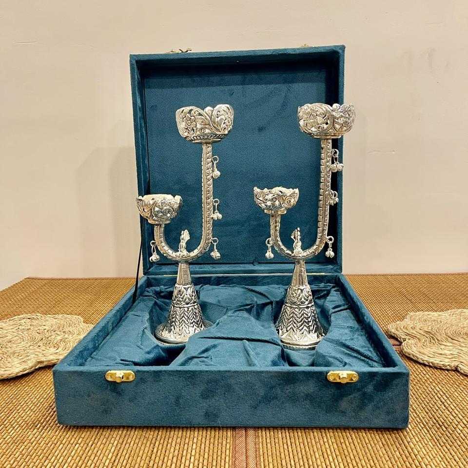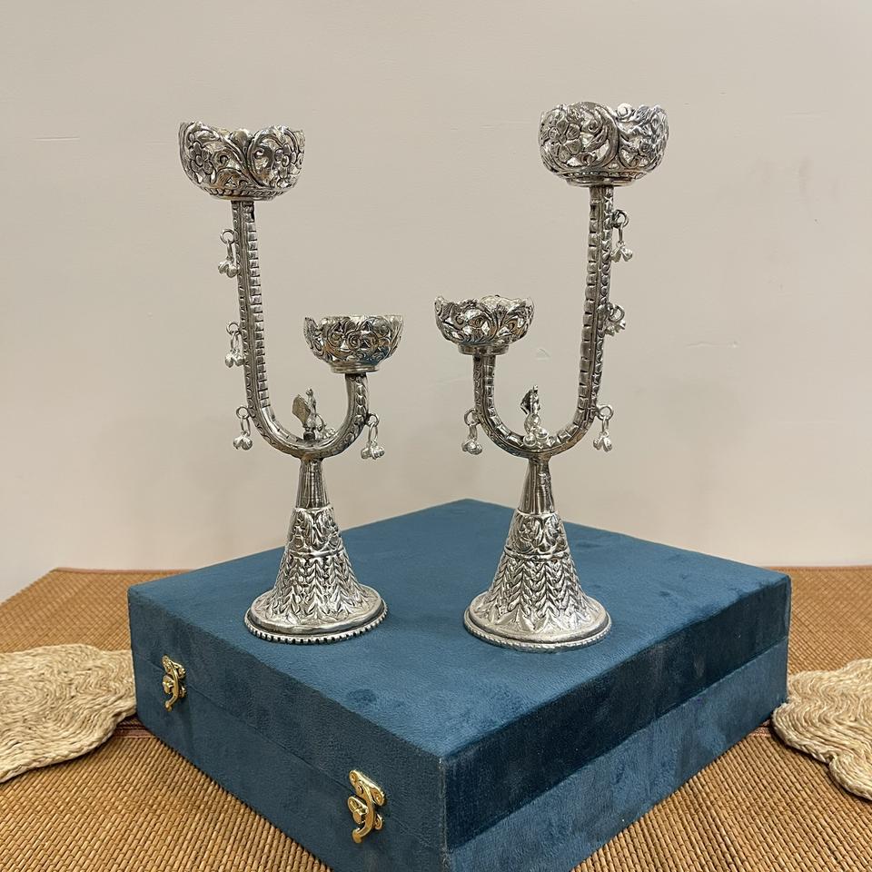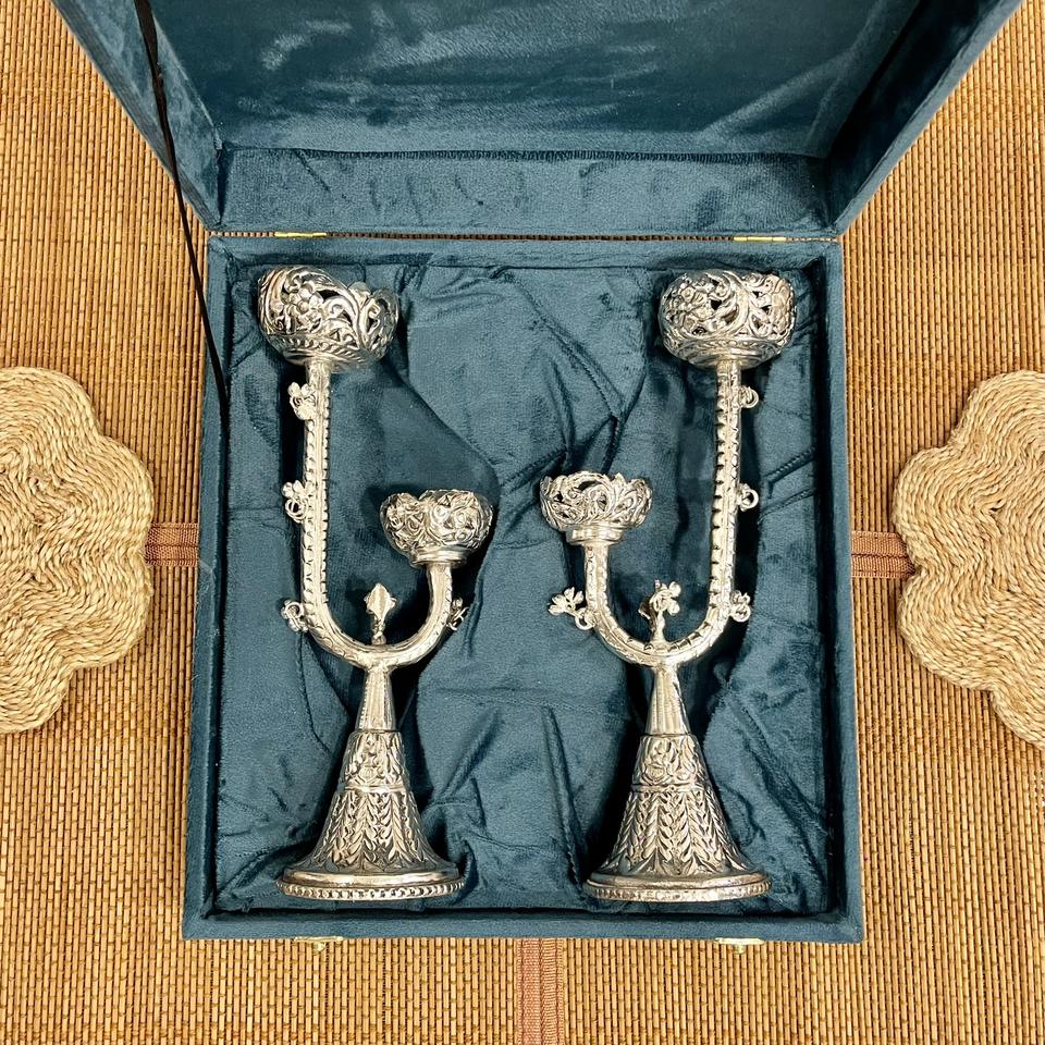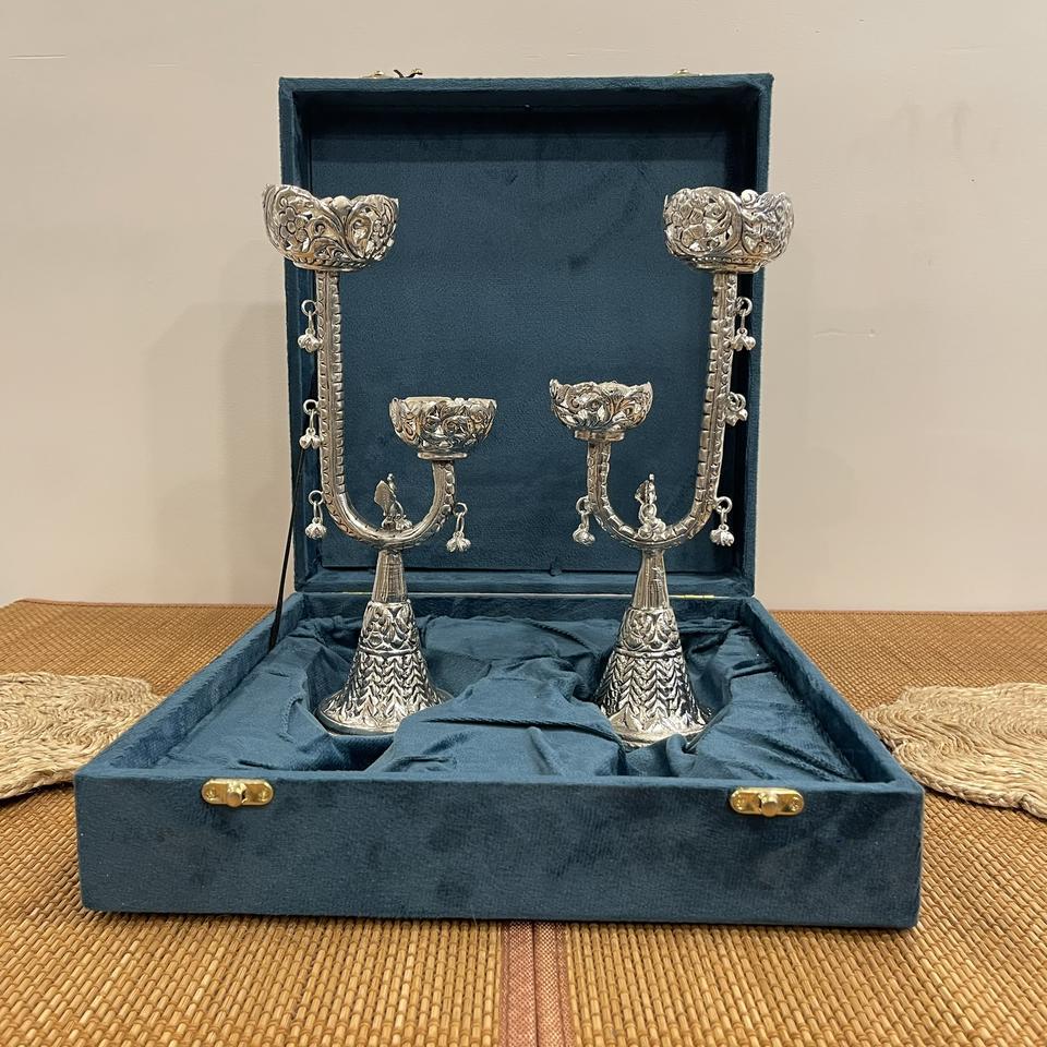 SILVER PLATED CARVING WORK CANDLE STAND WITH GLASS CANDLES ( PAIR )