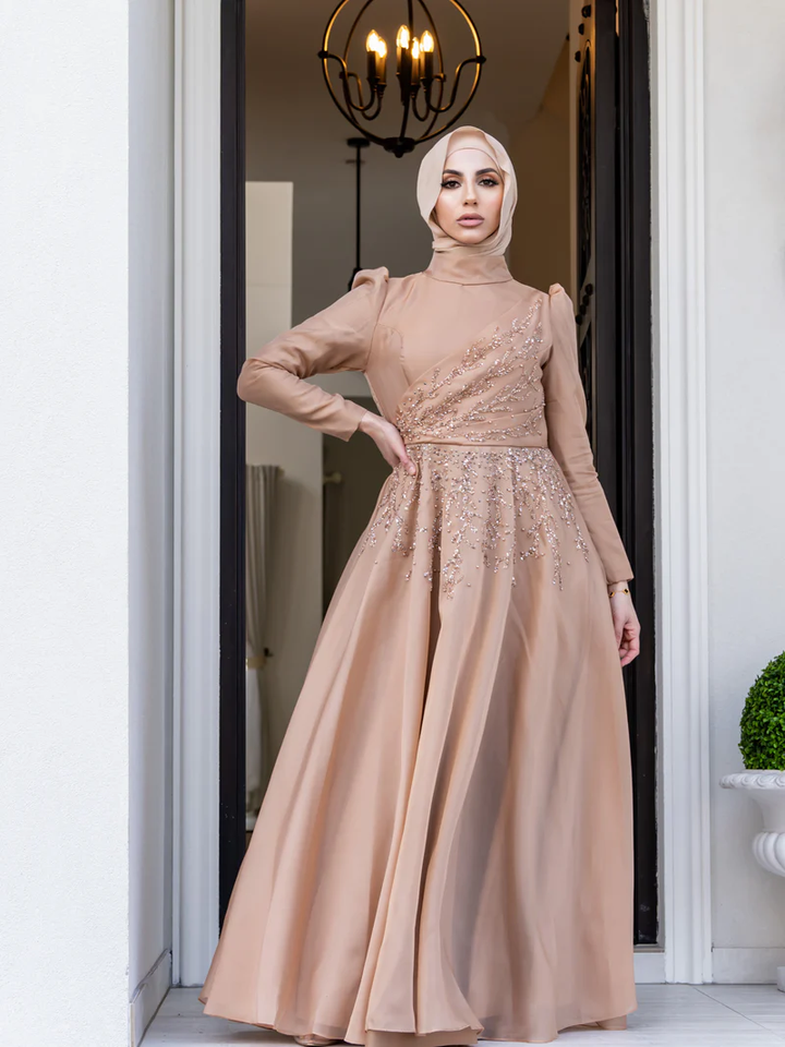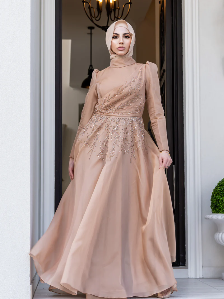 SIPO 2023 Abaya Women Muslim Puff Long Sleeve Fashion Pearl Beaded Maxi Dress Women Party Gown Luxury Evening Dress