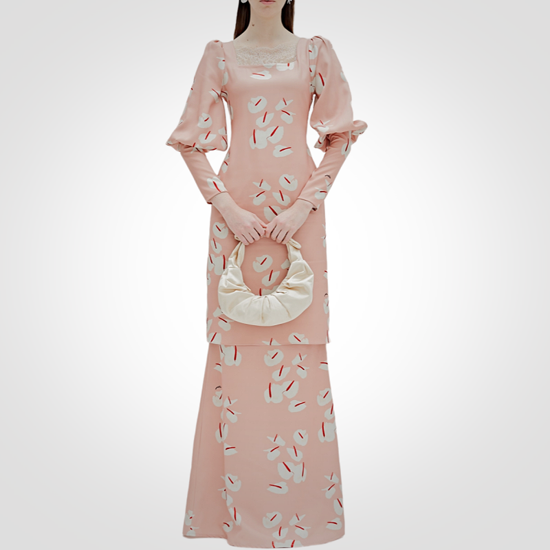 SIPO Eid 2024 Raya Malaysia Pastel Peach Lily Pad Design Lace Border Neckline Musulman Women Set Modern Baju Kurung