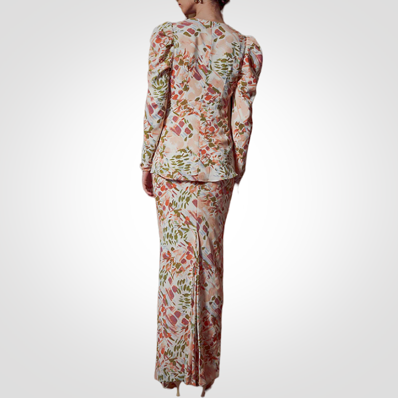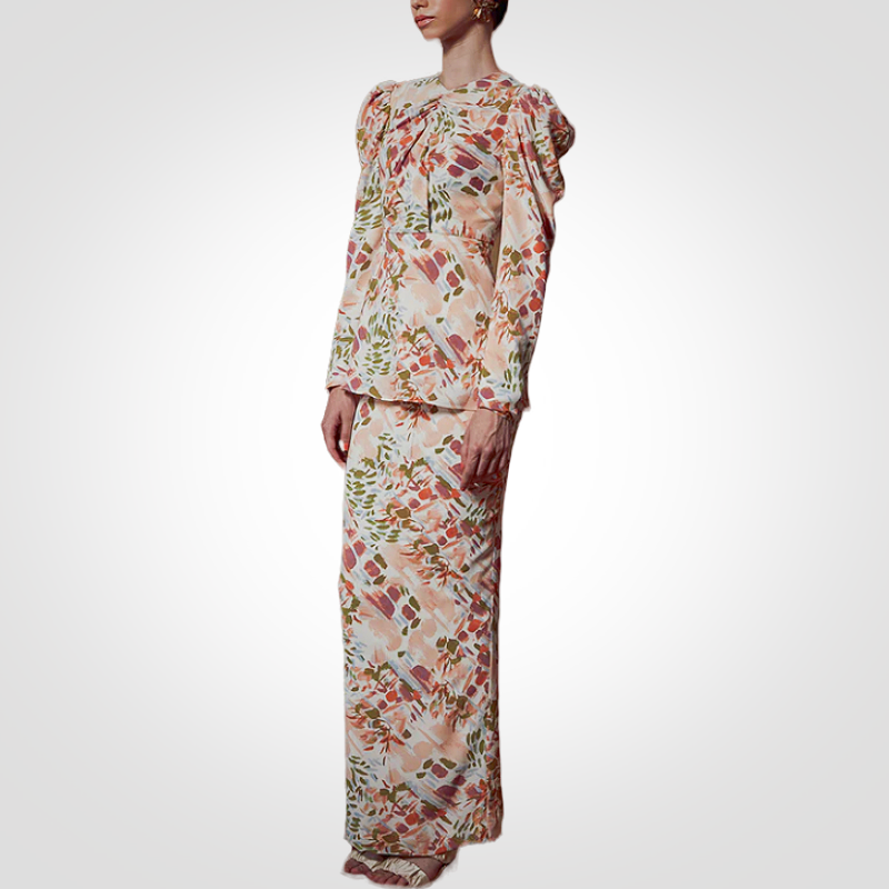 SIPO Eid Baju Raya Malaysia Short Kurung Ruched Neckline Puffed Shoulders Modest Evening Formal Print Women's Polyester Fiber