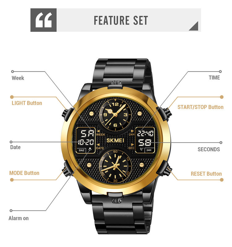 Men's Analog Watch Stainless Steel Band Waterproof Double Movement Watch Chronograph Alarm EL Light Date Week Count Down Time